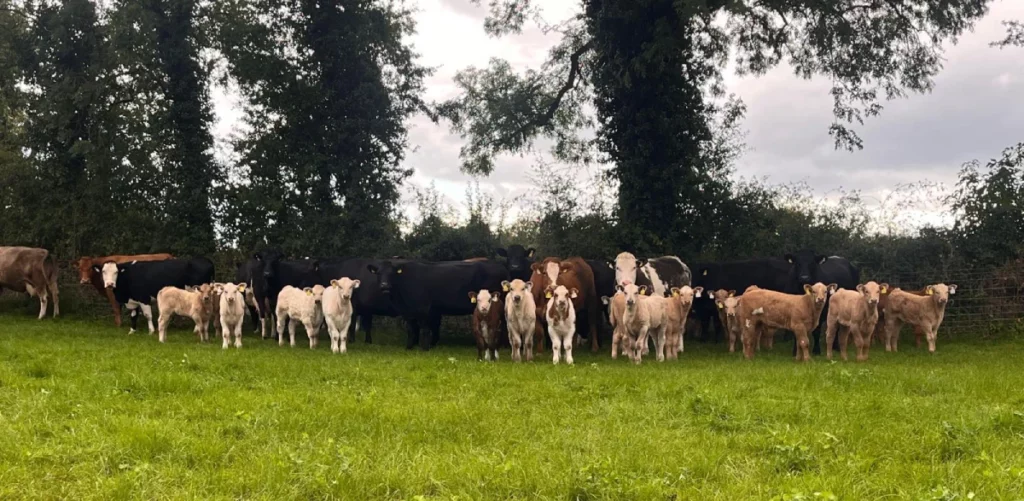 Jimmy and his family operate a 96-hectare mixed farm consisting of 82 hectares of grassland, 5 hectares of tillage, and 9 hectares of forestry. Their enterprise revolves around 90 high-quality suckler cows. All male progeny are finished within 16 months, and heifers not retained for breeding are finished at 21 months. Around 30 additional bulls are sourced locally for finishing. There are also 30 ewes on the farm. High genetic merit and targeted nutrition, incorporating red clover silage and supplementary concentrates, support strong weight gain performance and help achieve a low carbon footprint of 11.53 kg CO₂eq/kg of liveweight beef.